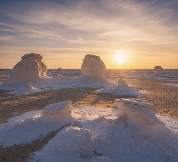 El Desierto Blanco será el punto más alto del tour. Está compuesto por formaciones de tiza blanca moldeadas por el viento, que parecen hongos gigantes o paisajes nevados en medio de la arena al llegar la puesta de sol. Acampar aquí, bajo las estrellas, será una de las experiencias más memorables de Egipto. Prepárate para vivir una noche única e inolvidable, con una cena barbacoa junto al fuego y alojamiento en vivac.