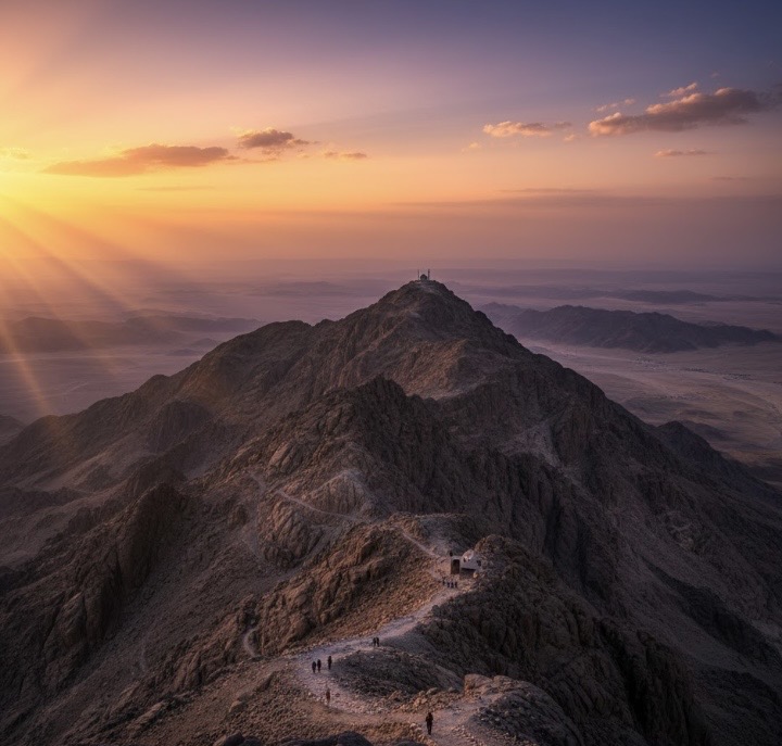 Sobre las 21 horas, con nuestro desayuno tipo picnic, saldremos del hotel para realizar la excursión nocturna al Monte Sinaí, una experiencia que mezcla el reto físico personal con una carga espiritual y visual impresionante. Haremos el ascenso bajo el cielo del desierto, unos 2 kms. y 750 peldaños que se hacen a pie. Tras unas 3 horas de subida, llegaremos a la cima, donde nos reciben una pequeña capilla y una mezquita.